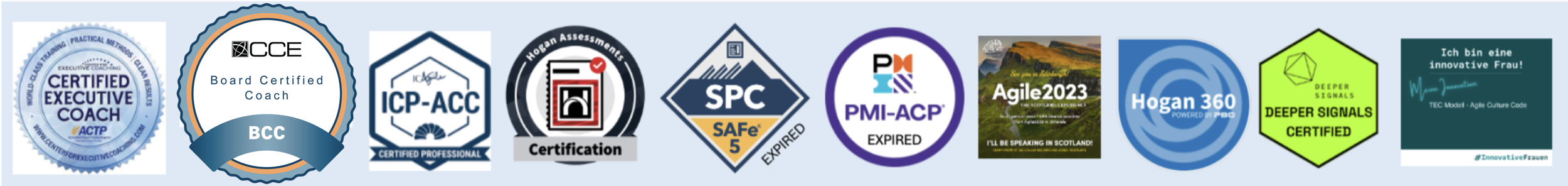 Weiterbildungen (Auswahl): Certified Executive Coach (CEC, USA), Board Certified Coach (BCC; CCE, USA), Certified SAFe 5 Program Consultant (Scaled Agile), Certified Professional Agile Coaching (ICP-ACC,), Agile Certified Practitioner (PMI-ACP), Deeper Signals Coaching Certificate, CEC Coach Master Toolkit, Hogan Assessments, Leadership Versatility Index, Belbin Team Roles, Leadership Circle, Motivstrukturanalyse, RB5P, SKID, Train the Trainer Verhaltensbasierte Interview Technik (BIT)